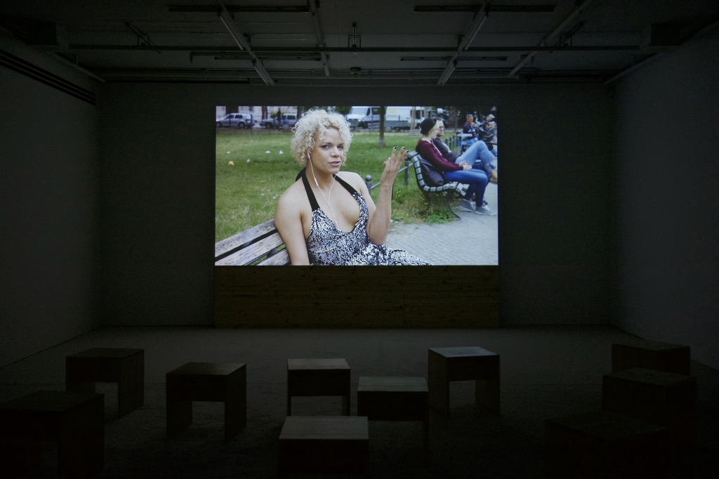 L’œuvre filmique est une captation d’une performance mettant en scène la DJ d’origine vénézuélienne Aérea Negrot.1 Le lieu de l’action est hautement symbolique. Negrot prend place sur une plateforme tournante disposée au milieu de l’Oranienplatz, un parc du quartier Kreuzberg de Berlin occupé entre 2012 et 2014 par un camp de réfugiés protestataires.2 En septembre 2012 on compte environ 50 demandeurs d’asile qui chemineront sur la place publique au bout d’une marche de 600 km depuis Würzburg (Bavière). À ce petit groupe de marcheurs se sont joints d’autres réfugiés provenant de divers camps. À l’apogée du mouvement, 450 de ces individus fuyaient des troubles politiques de différents pays d’Afrique, notamment de Libye, suite à l’éclatement de la guerre civile sous Mouarmmar Kadhafi.